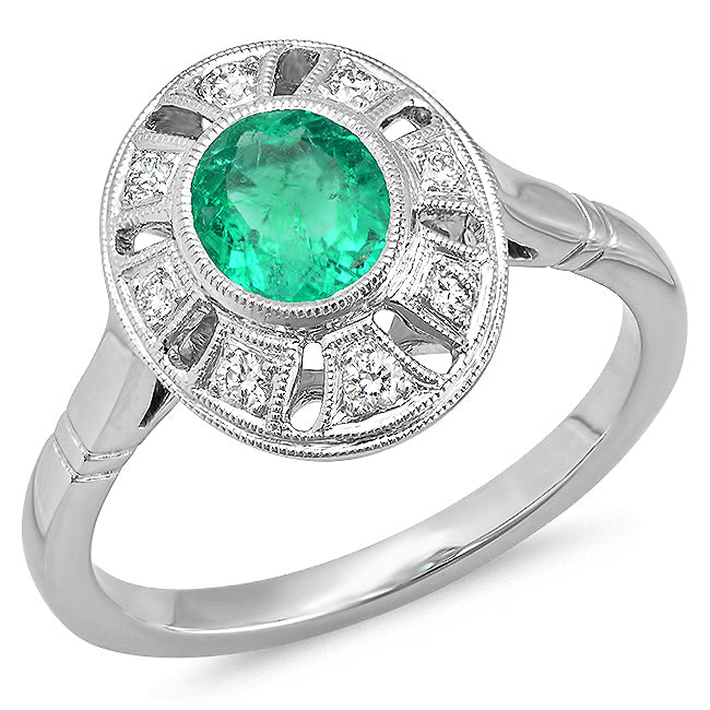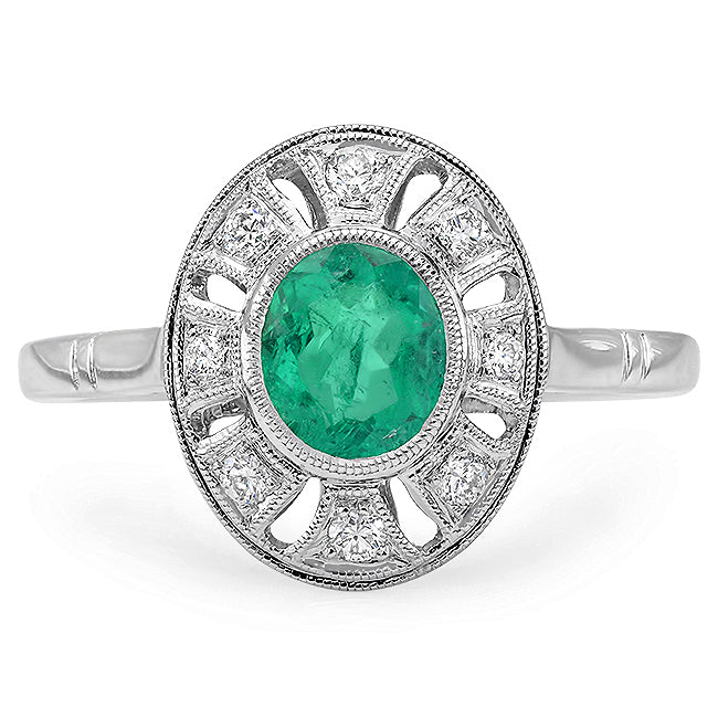 Total Diamond Weight: 0.15 ct Total Emerald Weight: 0.74 ct Diamond Quality: H/SI1 Mount Center: 6x5 mm Oval Cut